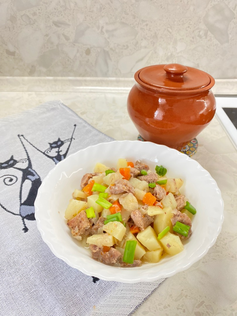 Морковь мелко порубить/нарезать. Шаг 2 Мясо нарезать на кубики примерно 2-3 см. Соединить все ингредиенты. Добавить соль, перец и специи. Перемешать. Шаг 3 Переложить овощи с мясом в горшочки. Налить в каждый горшочек воды, примерно по 50 мл. Ставим в духовку при 180 градусах примерно на 1 час. У мня вышло 1 час 10 минут, после того, как духовка разогрелась. Приятного аппетита. Смотри видеорецепты на моем канале Ютуб 👉🏼 @svetlana_recipes