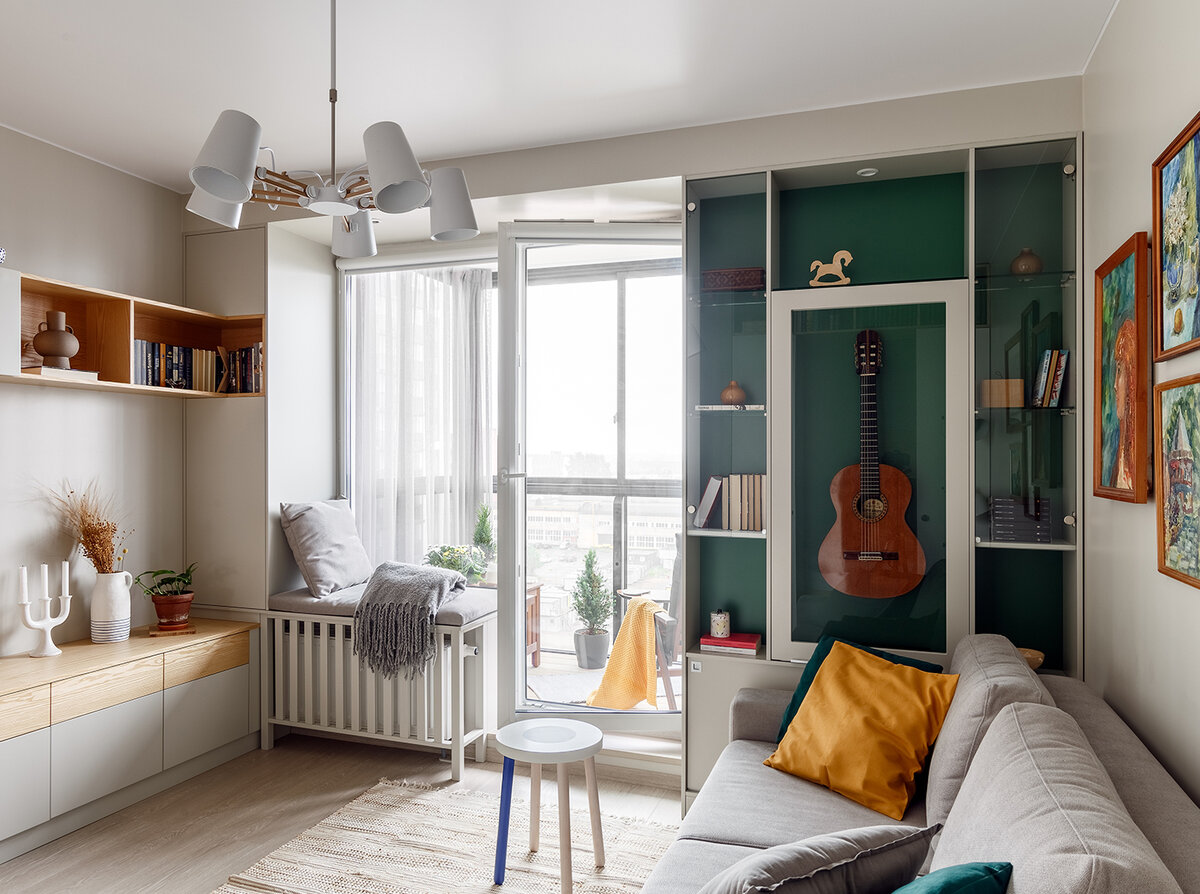 Дизайнеры студии Малицких спроектировали маленькую квартиру площадью 34 кв. метра в новом ЖК Magnifika Lifestyle в Петербурге. Исходное пространство с хорошей планировкой от застройщика досталось авторам с предчистовой отделкой. Интерьер создавался для женщины с двумя взрослыми детьми, которые периодически приезжают навестить ее в родном городе. Основные пожелания — грамотное планирование систем хранения и эргономики в целом. «Главную роль в наших проектах всегда играет личность заказчика, — рассказывают дизайнеры. — Мы не делаем абстрактно или универсально, синергия „человек и дизайн“ для нас важнее. В данном случае основная идея маленькой квартиры — спокойный, светлый интерьер с визуально легкой системой хранения. Пространство, в котором найдется место живописи, фотографиям, гитаре и другим ценным вещам заказчицы». «При выборе отделочных материалов мы руководствовались, в первую очередь, практичностью и удобством в уходе. В компактных пространствах это актуальный вопрос. Для стен исп