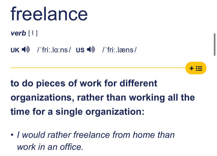 "Фрилансить" (глагол): делать части работы для различных организаций, а не работать всё время на одну организацию.