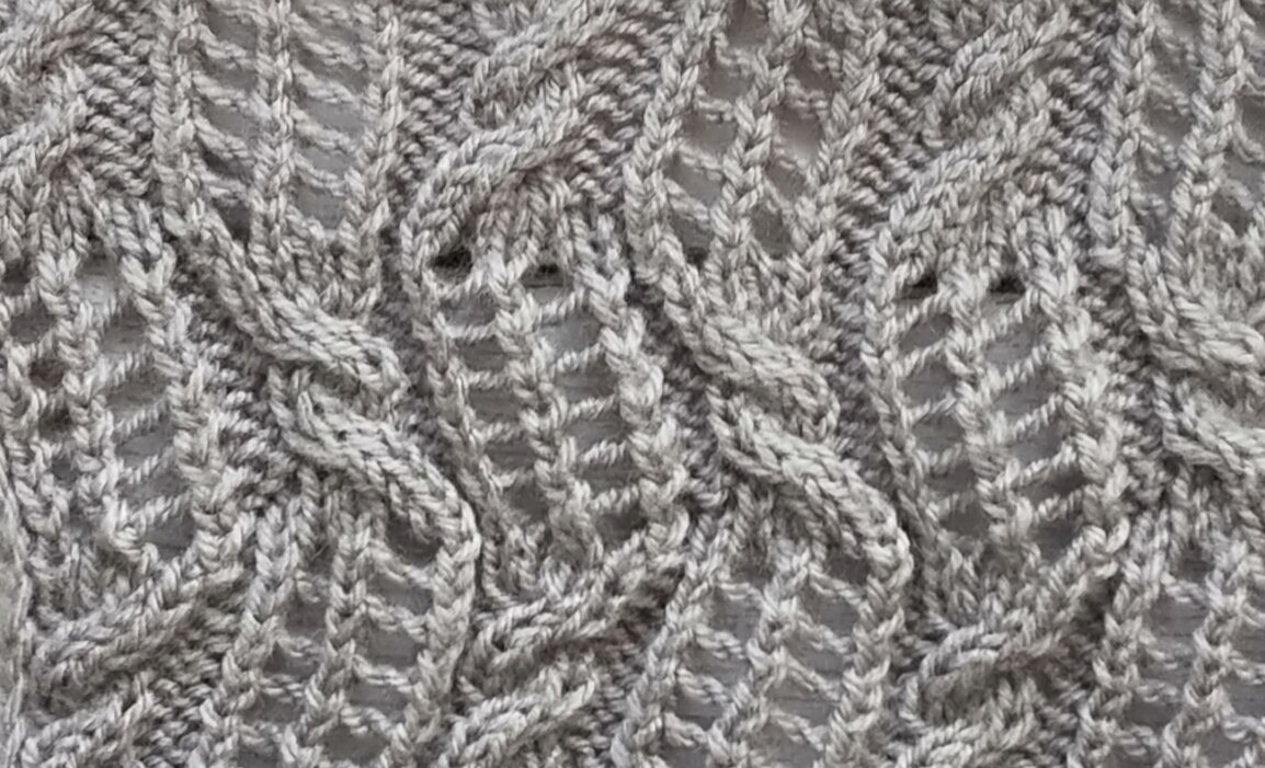 5-й р.: кром., 1 изн., 1 лиц. скрещенная, 1 накид, 2 п. вместе лиц. с наклоном вправо, 1 накид, 2 п. лиц. с наклоном вправо, 2 изн., 2 п. оставить на вспом. спице за работой, 2 п. лиц., петли со вспом. спицы провязать лиц., 1 изн., кром.