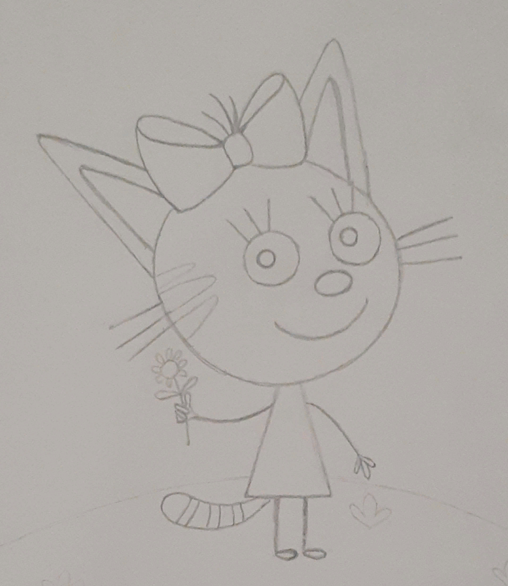 * Кисти нейлоновые 1. Сделаем набросок кошечки. Она будет стоять на полянке и держать в лапке цветок. Заметим, что голова и уши кошки гораздо больше её тела. 2. Начнём раскрашивать шёрстку. Смешайте немного жёлтого и оранжевого, затем прокрасьте голову, ушки и хвост. 3. Используя красный или малиновый, придадим цвета её одежде: бантику и платью. Сразу же раскрасим лепестки и серединку цветка, используем для этого красный и жёлтый. 4.Начнём обводить персонажа. Нос, глаза, усики кошки сделаем чёрным цветом. 5. Продолжим обводить Карамельку. Наберите коричневого цвета и пройдите по контуру персонажа. После этого она будет готова. 6. Салатовым цветом нарисуем листья и стебелёк цветка, раскрасим полянку. С помощью тёмно-зелёного прорисуем травинки на поляне.