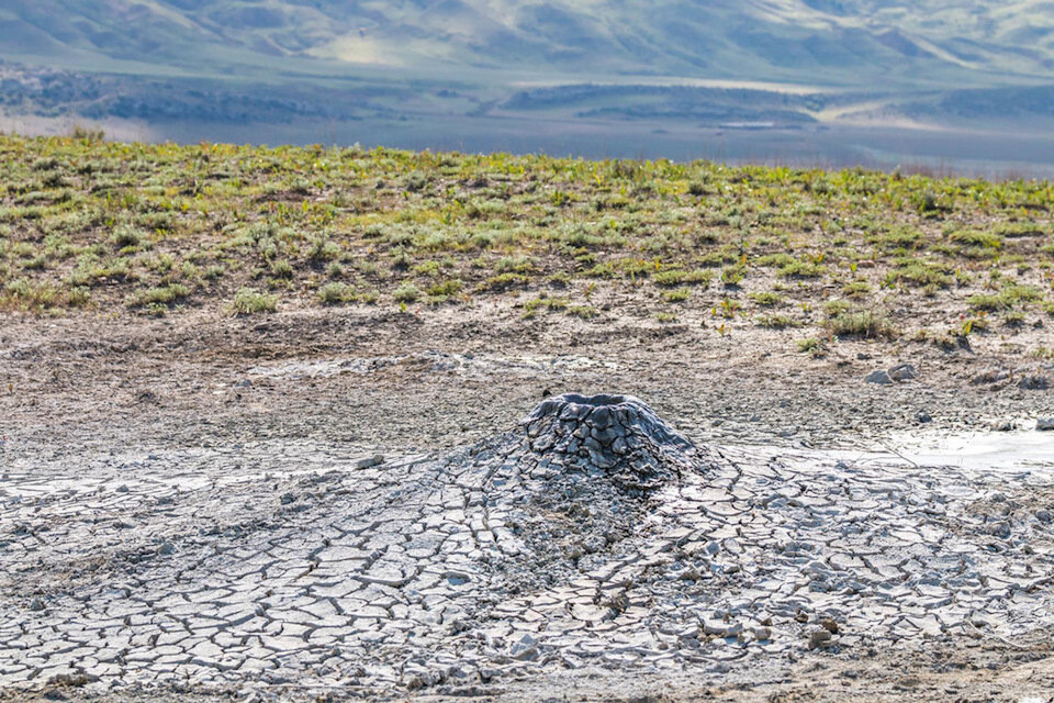 В одной из прошлых частей упоминалось грязевые и нефтяные вулканы Тахти-Тепа . Очень интересная булькающая достопримечательность. С высоты Тахти-Тепа (он же Тахти-Тефа) водохранилище хорошо видно, однако на самом деле, до него достаточно долго добираться: Большой перепад высот, такой, что на одном из спусков квадрокоптер тихо сошел с ума и решил, что он уже под землей.Зато наверху растрескавшаяся земля, а внизу — прохлада, деревья и цветы. Отличное место для ужина. Местные коровы крайне самостоятельные, а вот лошадей часто привязывают к ослам, чтобы далеко не ускакали. Где-то на эти степи год назад выпустили новое стадо джейранов. Мы их так и не встретили, зато встретили плакат, где на двух языках(!) было написано обращение к этим газелям. Администрация области поздравляла их с возвращением в привычную среду обитания. Самая частая деталь пейзажа: Овец очень много. Спустя какое-то время к ним прицепилось очень емкое обозначение: блохи. Так и передавали по рации: “Осторожно, на дор