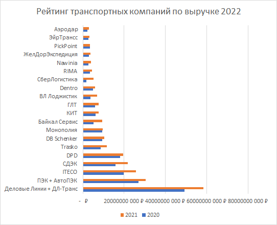 МестоКомпания20202021Динамика за год1Деловые Линии49 100 000 000 ₽58 300 000 000 ₽19%2ПЭК26 900 000 000 ₽30 400 000 000 ₽13%3ITECO19 700 000 000 ₽25 600 000 000 ₽30%4СДЭК15 700 000 000 ₽21 800 000 000 ₽39%5DPD18 000 000 000 ₽19 600 000 000 ₽9%6Trasko8 700 000 000 ₽11 600 000 000 ₽33%7DB Schenker9 400 000 000 ₽10 400 000 000 ₽11%8Монополия9 400 000 000 ₽9 700 000 000 ₽3%9Байкал Сервис5 200 000 000 ₽9 300 000 000 ₽79%10-11ГЛТ5 900 000 000 ₽7 700 000 000 ₽31%10-11КИТ6 200 000 000 ₽7 700 000 000 ₽24%12ВЛ Лоджистик3 700 000 000 ₽7 000 000 000 ₽89%13Dentro4 900 000 000 ₽5 900 000 000 ₽20%14СберЛогистика1 600 000 000 ₽5 200 000 000 ₽225%15RIMA3 500 000 000 ₽4 500 000 000 ₽29%16Nawinia2 600 000 000 ₽4 000 000 000 ₽54%17ЖелДорЭкспедиция3 000 000 000 ₽3 600 000 000 ₽20%18PickPoint3 500 000 000 ₽3 500 000 000 ₽0%19ЭйрТрансс2 700 000 000 ₽3 300 000 000 ₽22%20Аэродар2 100 000 000 ₽2 900 000 000 ₽38%