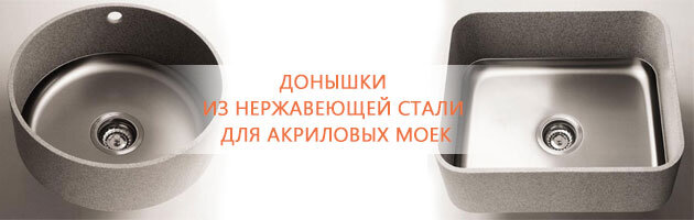 Столешница и раковина из акрила – это гармонично, практично и попросту красиво. Они вписываются в интерьер и придают ему элегантности. Однако у моек из акрила есть слабые места, которые мы скрывать не будем из уважения к вам. Слабое место – дно, постоянно подвергающееся воздействию, и на поверхности часто появляются сколы, а вокруг сифона – микротрещины. Перепады температуры также влияют на состояние раковины: акрил не любит контрастов показателей. Также изготовители часто говорят, что дно с радиусами при сопряжении со стенками – самая трудоёмкая часть работы. Решение: донышки из нержавеющей стали для акриловых раковин. Акриловые мойки с донышками из нержавеющей стали – достойный вариант. Они: 1. Менее чувствительны к ударам. 2. Выносят высокую температуру. 3. Не заметны царапины. 4. Можно вмонтировать измельчитель для пищевых отходов. 5. Легки в уходе. 6. Прекрасно интегрируются в столешницу. Акриловые раковины позволяют убрать трудоёмкие процессы, которые обычно возникают при изготов