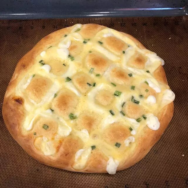 1 яйцо 140 граммов сыра 4 грамма быстродействующих дрожжей 20 граммов сахара 200 граммов муки 3 грамма соли 40 граммов слиточного масла комнатной температуры 1 чайная ложка мелко порезанного чеснока 1 чайная ложка майонеза 2 стрелочки зелёного лука Шаг 1 Берём 1 яйцо, взбиваем венчиком. 1 столовую ложку взбитого яйца отложим "под плёнку". Шаг 2 В основную миску даём 4 грамма дрожжей, 12 граммов сахара. Перемешаем. Добавим 200 граммов муки и 3 грамма соли. Перемешаем. Шаг 3 Даём в тесто 80 мл тёплого молока и замешиваем тесто. Оно сначала липнет к рукам, но вымешиваем, вопрос "веры" и вуаля, не липнет! Шаг 4 Вводим в тесто 30 граммов сливочного масла комнатной температуры. Шаг 5 Выложим бушующий хлеб на противень и в духовку на 30 минут, чуть тёплая-холодная я разницу не заметил. Лучше накрыть влажным полотенцем, чтобы хлеб не подсыхал. Шаг 6 Пока отдыхает тесто приготовим чесночную заправку. Смешиваем отложенную ложку взбитого яйца, чайную ложку майонеза, мелконарезанные 3 зубчика чесн