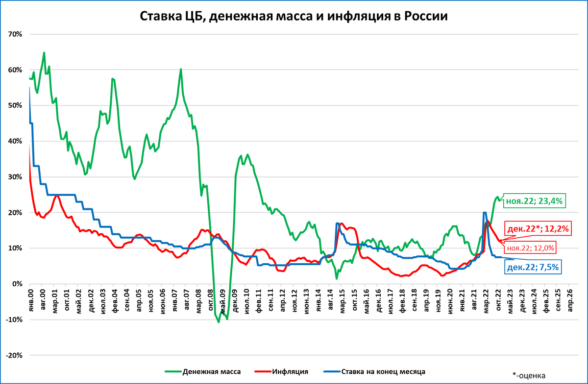 Ещё раз напомним, что добавление денег в 1999-2008 годах происходило при инфляции, находящейся под контролем, и даже снижающейся (см. график). Этому, прежде всего, способствовали ставки ЦБ, превышающие инфляцию (см. синюю линию на графике).