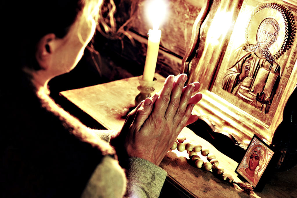 Мама пред иконами стоит.
