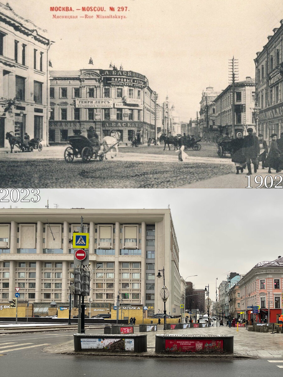 Многие московские исторические площади свой многовековой вид за XX век утратили. Не стала исключением и площадь Мясницких ворот у метро Чистые пруды. Раньше участок от современного проспекта Сахарова до метро Чистые пруды был застроен зданиями. Бульвара там не было. Еще раньше на этом месте стояли стены Белого города, которые были разобраны в конце XVIII века. Мясницкая улица в районе площади Мясницких ворот была довольно узкой и изгибалась на северо-восток. В 1920-е годы в Москве еще без метро здесь часто можно было увидеть такую вот картину: настоящий транспортный коллапс из всех видов транспорта. По правой стороне улицы на переднем плане виден дом, где когда-то размещалась пекарня Эйнема. Этот дом пошел под снос самым первым. В 1930-е году по проекту Николая Колли построили наземный вестибюль станции метро "Кировская". Тогда и площадь стали называть "Кировской". Но в народе это название не особо прижилось. Ахматова саркастически писала, что какие ворота могут быть в Москве у Киров