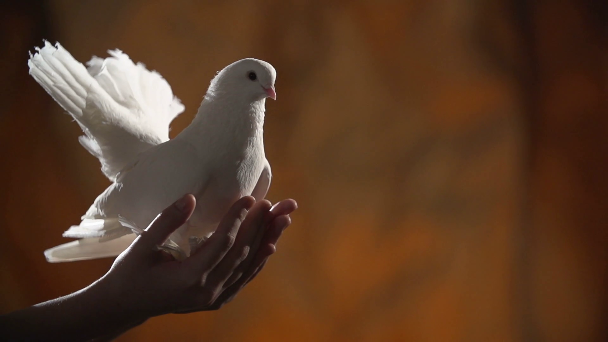 На руке сидит голубка