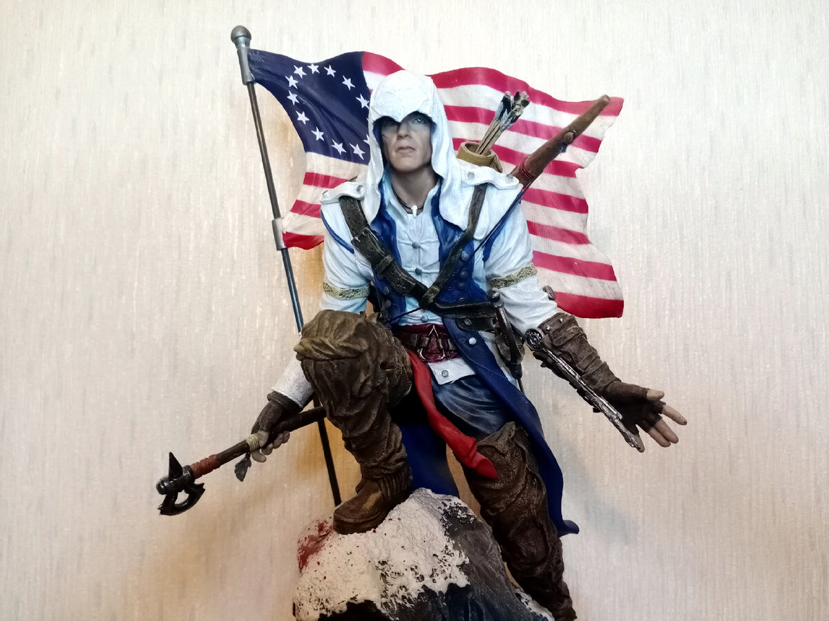 Март 2014 года — тогда всё и началось. Я всегда ходил вокруг да около, но буквально грезил о том, что у меня будет собственная коллекция таких вот фигурок. Честно говоря, не помню, где именно его брал... но на подставке есть шильдик «Ubisoft». Определённо помню, что покупал в каком-то лицензионном магазинчике. Да, дамы и господа, я один из тех, кому в своё время очень зашла третья часть серии. От неё буквально веяло фильмом «Патриот» (не с точки зрения похожести событий, конечно. Но красные мундиры, томагавк, эпичность трейлера...), поэтому, увидев трейлер, сразу же забрал себе компьютерную игру. А потом и самого Радунхагейду.
