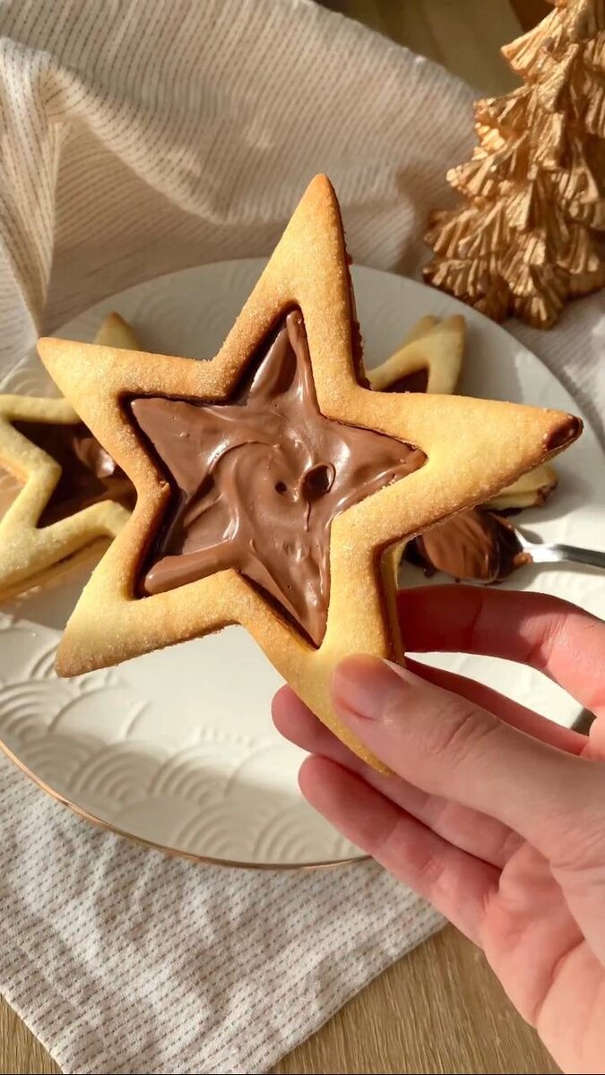 Раскатайте тесто шариком между двумя листами бумаги для выпечки. Снимите верхнюю часть бумаги и вырежьте звездочки с помощью формочки для печенья. Вырежьте вторую маленькую звездочку из половины больших звездочек. Посыпьте ванильным сахаром перед выпечкой . Выпекать 10 минут при температуре 180°. Они должны быть слегка подрумяненными. Смазать одну часть растопленным шоколадом или джемом и положить сверху звезду с отверстием .