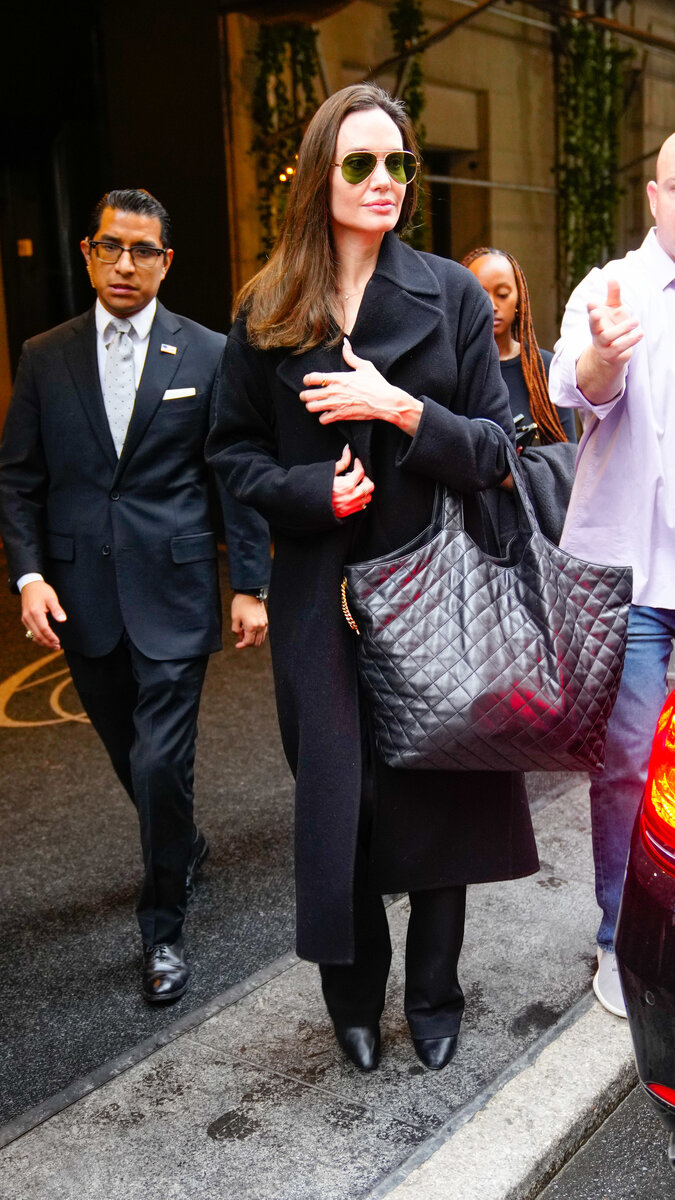 Анджелина Джоли покидает отель Нью-Йорка вместе с дочерью Захарой и показывает безупречный стиль, которому она следует долгие годы. Звезда появилась в черном тотал-луке, надев трикотажный топ, длинные прямые брюки и шерстяное пальто. Подчеркнула она образ кожаными сапогами, солнцезащитными очками и знаменитой it bag — тоутом Saint Laurent. Читайте также на нашем сайте: Подписывайтесь на нас в Телеграме, чтобы быть в курсе последних новостей!