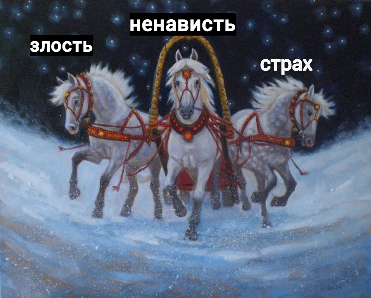 Потому как в процесс подключаются эмоции: злость, ненависть, страх. Вот три коня которые вырвались на простор взаимоотношений Запада и России. (или Востока, начало положено).