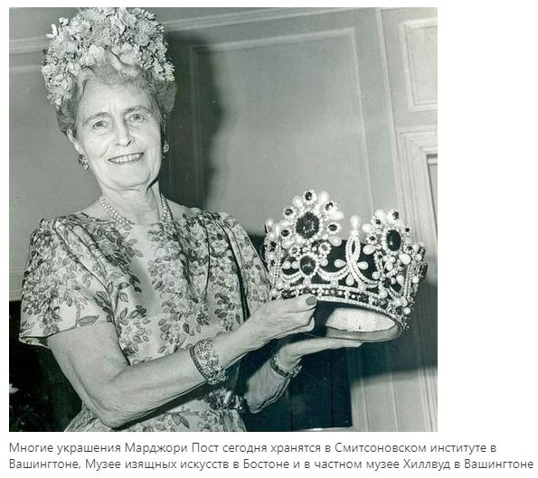 С 1937 по 1938 гг. Марджори Пост вместе с мужем вывезла из СССР (в обход таможни) десятки контейнеров с произведениями искусства и драгоценностями. Многие из этих предметов были приобретены, буквально, за символические копейки. Так "спасители России" (цитата господина Зюганова о коммунистах) поспособствовали созданию одной из самых впечатляющих по ценности коллекций русского искусства в США.