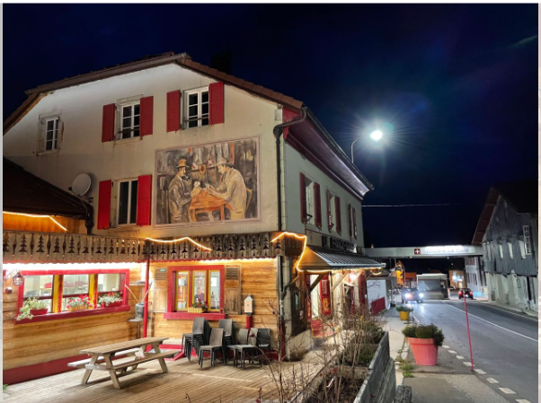 Сцена, на которой изображены двое мужчин, играющих в карты, а также на большой фреске на одной из внешних стен отеля, намекает на инцидент, который произошел в отеле в 1920-х годах, говорит Пейрон: швейцарский таможенник оштрафовал группу клиентов, которых он поймал за игрой в карты. Правонарушение? Не азартные игры, как некоторые ошибочно предполагали в то время, а тот факт, что они использовали французский набор карт на швейцарской стороне отеля без предварительной оплаты таможенных пошлин. На сегодняшний день в отеле разрешены игры, если карты не пересекают границу.