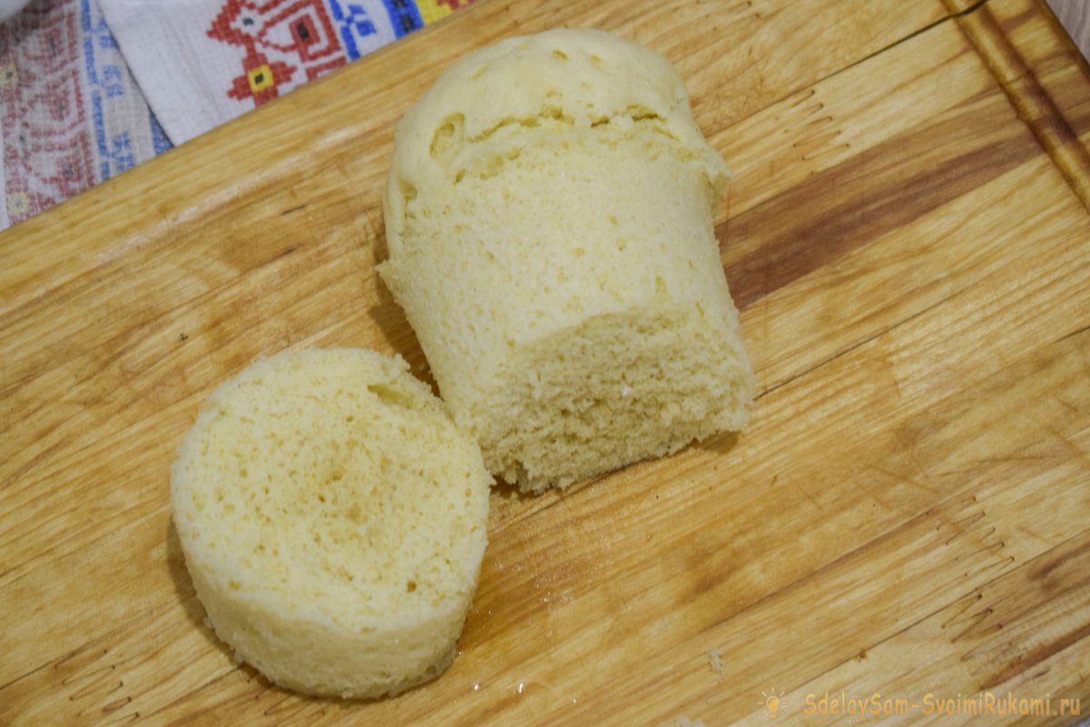 Ингредиенты: Мука пшеничная 3 ст.л Кефир 3 ст.л Яйцо куриное 1 шт Соль 1/2 ч.л Разрыхлитель 1/2 ч.л Готовим В миске взбить яйцо, посолить и взбить венчиком, влить кефир и хорошо перемешать до однородной массы. Муку перемешать с разрыхлителем, и постепенное добавить в смесь. Ложкой замесить однородное негустое тесто, по консистенции оно должно напоминать тесто для оладий. Далее полученную смесь нужно перелить в прочную жаропрочную форму (например кружку). Обязательно предварительно смазать маслом. Выпекать 4 минуты на мощности 850Вт. Приятного аппетита.