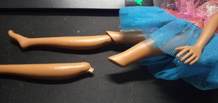 Дети ломают игрушки. Иногда - специально, иногда случайно, часто - из-за качества игрушек. Но это надо чинить. Нет, конечно, у многих есть куча денег, желание "дать лучшее", и т.п. Что приводит к постоянному круговороту "папахочу" и "чокупила". Мы, увы, безграничным бюджетом, на детские хотелки не располагаем и... жалко выбрасывать то, что можно починить. Если - можно починить. Когда мальчик - проще: машинки и прочее. А вот девочки.... девочки любят куклы. Особенно чтобы куклы были модные принцессы, феечки и прочие генно-модифицированные с гипертрофированными конечностями. И поющие писклявым динамиком пони с крыльями. Ладно, про хирургическое вмешательство с разрыванием живота лошади с целью вырезания динамиков - как-нибудь в другой раз, ибо сегодня - эндопротезирование суставов. Первая жертва: разрыв коленного сустава. Материал - странный. И весьма эластичный, и при этом - плотный. Все спаяно из отдельных элементов, но сам сустав изначально был запаян. В остаток сустава аккуратно вкру