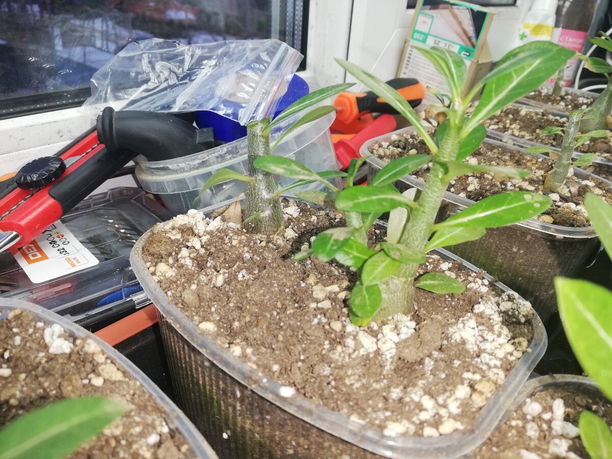 Сейчас хоть и зима, но в моей оранжерее температура не опускается ниже 25-26 градусов в самые холодные дни, а так вообще держится в районе 29-30 градусов. И это без включения экстренного подогрева корней инфракрасным излучением от греющей плёнки (когда под -30 на улице было, только тогда включал). Тем самым температурный стресс у Адениумов отсутствует, а вот отсутствие солнца на них как раз сказывается прилично. У меня установлено 5 квадратных светодиодных светильников по 50 ватт и их явно не хватает. Буду добавлять светодиодные прожектора. Мне их нужно 3 штуки из которых 2 уже у меня есть. Один оставшийся в магазин не завезли. Анекдот. Жду, когда приедет. Тогда все сразу и добавлю. Так вот. Солнца моим Адениумам маловато, и они стали вытягиваться вверх, а не толстеть своими каудексами. А также из-за отсутствия нормального солнечного света саженцы «думают» как наесться, а не как стать «кучерявыми» и пустить дополнительные ветки и потому вторую задачу практически все проигнорировали. Ес