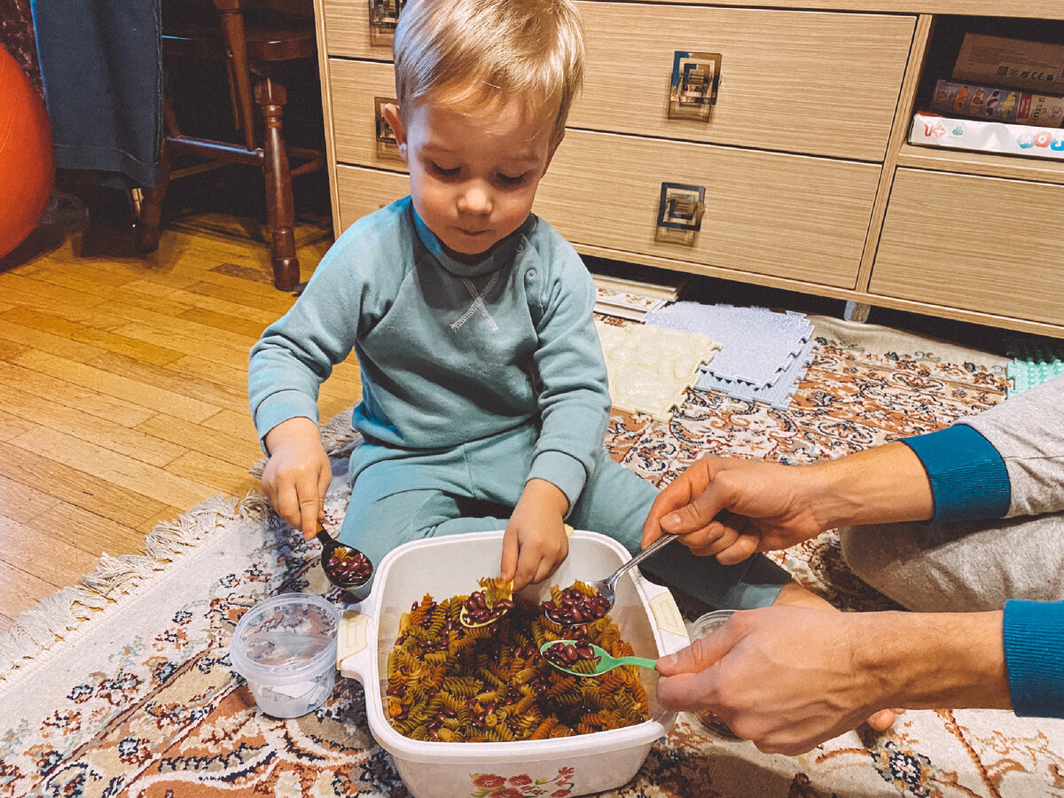 Пока Сёме это сложно. Он пытается зачерпнуть одновременно, понимает, что не может, происходит прям микрозатык, и он продолжает уже по очереди. Тем не менее пробуем каждый день.