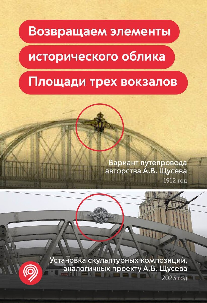 Добрый день! ⚒ На арках ж/д-путепровода на Площади трех вокзалов (Каланчёвской) установили первую скульптурную композицию из металла — двуглавого орла, в центре которого — Георгий Победоносец Всего их установят 6, и у них будет подсветка. Их сделали по историческому проекту архитектора А. В. Щусева. Он предлагал украсить арки ж/д моста такими скульптурами еще в 1912 году.