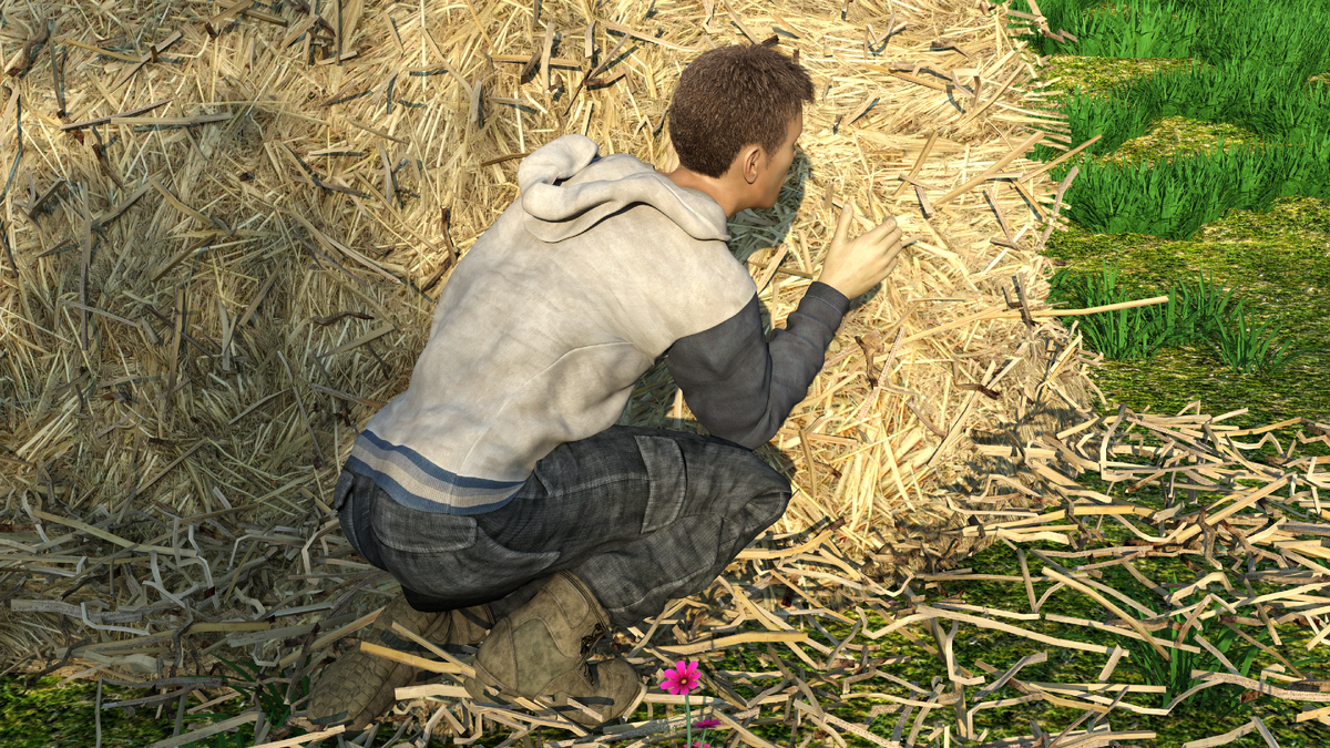 Пролог Сказки. Глава 1 (часть 1). Спалось герою очень сладко В душистом сене у ручья, И всю усталость без остатка Ночь смыла. Песни соловья И стрекотания цикады Затихли. Утренней прохладой Повеял лёгкий ветерок, И Майк услышал голосок. Мелодия плыла над лугом, Сливаясь с песней ручейка, И легче взмаха мотылька Летели ноты друг за другом. Конечно, Майк не утерпел И из-за стога подглядел. Шум ручейка и нежный голосок, напевающий простенькую мелодию, разбудили Майка рано утром. Выглянув из-за стога молодой человек увидел чудесную картину: освещенная утренними лучами солнца девушка умывалась в ручье. Девушка не видела Майка и тихонько напевала песенку. В синем небе над полями и лесами улетают птицы вдаль, крылом маня. Если спросишь тихо, что случилось с нами, то отвечу громко, я люблю тебя. У нас нет с тобою общего ни грамма, мы не сходимся с тобой как свет и тень. Нам мешает твоя красная панама, что ты носишь не снимая целый день. Внезапно девушка прекратила петь и оглянулась. Майк едва