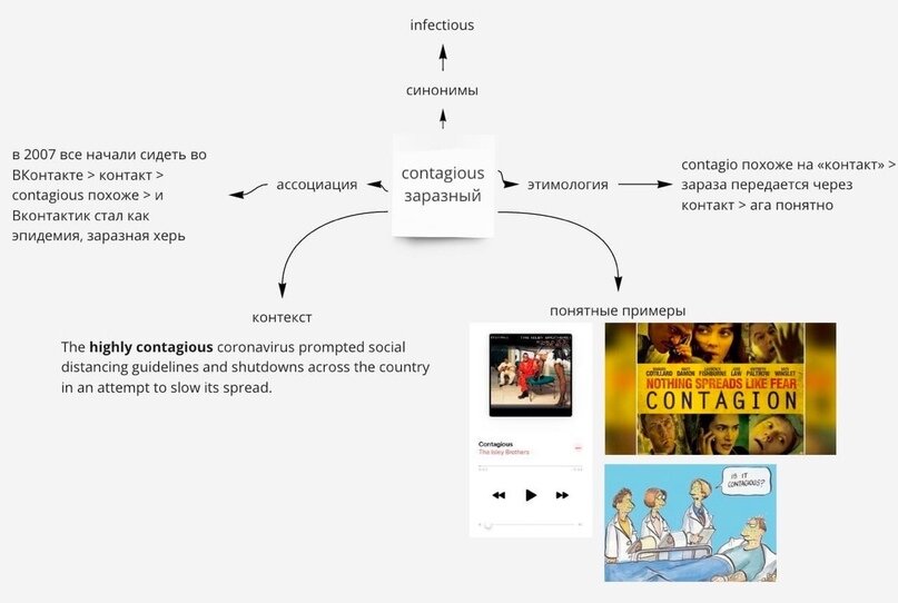 В контексте познания часто работает так: чем больше времени инвестируете в прогресс, тем с большей вероятностью он наступит. И с тем меньшей вероятностью новая информация потеряется. Как это работает в изучении новой лексики? Коротко: собрались поучить слова → распечатали список с Лингвалео → положили в рюкзак с мыслью «в метро гляну» → не сделали ничего → запомнили 1 слово случайно. Затраты по усилиям — 2/10, по времени — 4 минуты. Итог — 1 слово. Или. Собрались поучить слова → выписали их руками в блокнотик → заморочились с контекстом, добавили примеры использования → налепили стикеров с ассоциациями на каждое слово → нагулили по парочке синонимов и антонимов → продублировали новые слова в приложение → действительно уделили этому 10 минут. Затраты по усилиям — 6/10, по времени — 30 минут. Итог — 18 слов. Это грубо, но принцип понятен. Посему предлагаю учить слова с помощью АССОЦИАТИВНЫХ КАРТ, с их помощью можно пополнять словарный запас и не забывать новое на следующий день. Майндкар