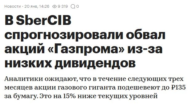 Аналитики Сберинвестиции открыли торговую идею на продажу акций Газпрома с целью 135 рублей за акцию в течение 3 месяцев. На данный момент они стоят около 159 рублей за акцию, таким образом, аналитики ожидают падения еще, как минимум, на 15% от текущих уровней. Что в этом такого? Все брокеры постоянно публикуют свои торговые идеи, часть из них сбывается, а часть - не сбывается, это вполне нормальный и естественный процесс. Важно то, что, как я уже не раз говорил, котировки акций и их динамика отражают реальную ситуацию в бизнесе компании. И российских компаний это касается в намного большей степени чем, например, американских, где фондовый рынок в разы сильнее развит, и в котировки заложена большая доля спекулятивных позиций. И ситуация с котировками Газпрома и этим прогнозом является лишним подтверждением его финансовых потерь от резкого падения экспорта до уровня объемов 1980 года. Потерь не только в натуральном, но и в денежном выражении. И текущих, и будущих потерь, поскольку в цен