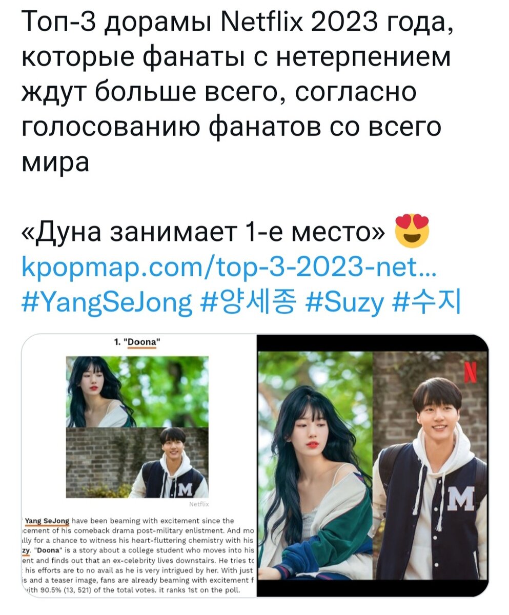 🔥 Популярный портал KPOPMAP провел голосование среди дорам, выходящих на Netflix в 2023 году . А именно - какие именно дорамы фанаты с нетерпением ждут больше всего. По мнению фанатов по всему миру был выявлен Топ-3.👇 🌟 3. "Черный рыцарь" с Ким У Бином. По сюжету Ким У Бин сыграет легендарного курьера по имени «5-8», человека, который доставляет заказы независимо от того, какие невзгоды его ждут. Наряду с Ким У Бином звезда-новичок Кан Ю Сок играет роль молодого человека по имени Са Воль, который мечтает стать доставщиком, чтобы дать надежду выжившим. Актриса Ли Сом присоединяется к этим двоим в качестве военного офицера по имени Со Рён, у которого особые отношения с семьей Са Воль. 🌟 2. "Ежедневная доза солнечного света" с Пак Бо Ён и Чан Дон Юном. Пак Бо Ён - Чон Да Ын, медсестра, перешедшая в психиатрическое отделение. Все сложно и неуклюже, но к пациентам она относится искренне и растет мужественно. Ён У Чжин - Дон Го Юн, хирург-проктолог с причудливой личностью. Улыбается, ви