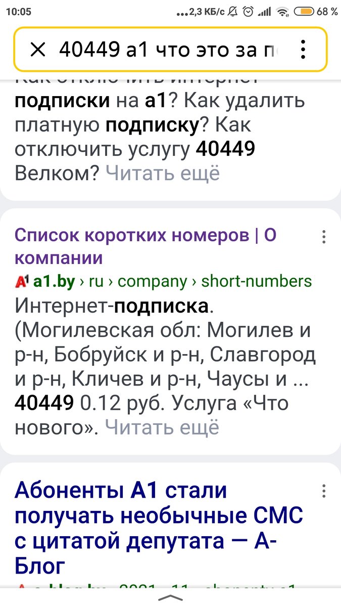 Столкнулся с такой ситуацией, в сотовой сети А1 стали приходить СМС сообщения от номера 40449, оказалось, что это платная подписка от какого-то партнёра А1. Называется Что нового.Подключение произошло случайно после завершения разговора. Поискал в интернете как отключить, все сайты предлагают одно и тоже, отправить юссд запрос 4043*5# трубка, но он не работает. Надо набирать *404# трубка, появится меню из трёх пунктов, выбрать цифру 2 и отправить смс, это и есть отключение услуги Что нового.данный юссд код нашел на сайте а1.by - список коротких номеров Или в телефоне меню сим, что нового, об услуге ,нажать ок получить информацию.