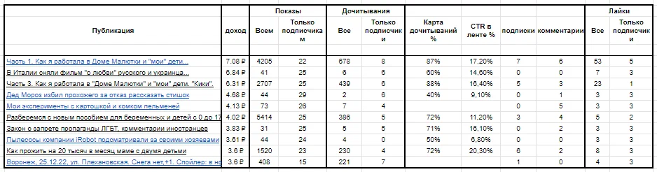 Соотношение просмотров и оплаты в ДЗЕНе - равнозначно? В продолжение анализа статистики давайте посмотрим на соотношение статистики по топ-показам и просмотрам и узнаем, сколько же "заплатили" за топовые по просмотрам статьи? Предыдущая статья: Итак, статьи из топа по просмотрам и показам: А по "доходу" в топе статьи: Вот тут подробнее писала про статистику: Итоги Как видите, большое количество показов и просмотров не гарантирует большую оплату. Статья по самым высоким (более 5000) показам про пособия получила чуть более 4х рублей, а коротенькая желтая статейка "на коленке" про "любовь" хоть и получила всего 41 показ и 6 просмотров, по оплате получила 6,84 рубля. А "статья" про 800 руб на 2 недели хоть и была какое то время в топе популярных, но "заработала" всего 0,26 копеек. Страшно подумать как много)) А еще была статья, которую я старалась писала об одном моменте из истории мира, так на неё всего 2 человека зашло и то по моей ссылке с другой статьи, посмотреть что это)) Пик