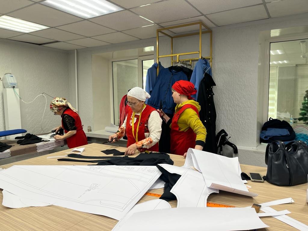 Клара Жангужина стояла у истоков зарождения производства. Она — многодетная мама. А теперь ещё и опытный закройщик, вышивальщица.