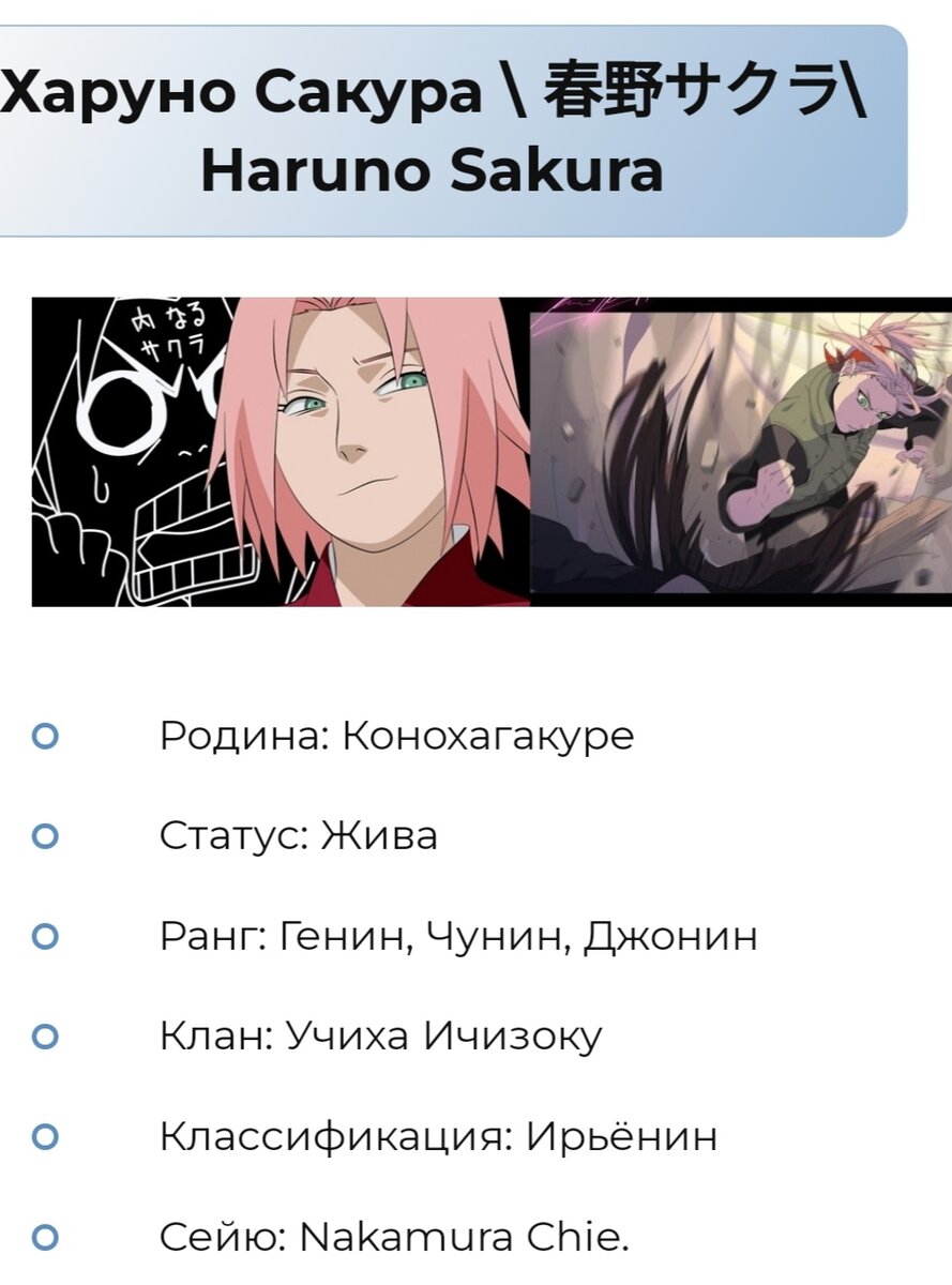 Реакция на куноичи из Наруто Нашу реакцию начинает сакура. Её статистика не плохая ,ведь она находится сейчас на ранге Джонина.Живёт она в Конохе (Конохагаре). Является медиком.Перешла в клан Учиха. У Сакуры есть способности к Гендзюцу. Её наставником была легендарный Санин .Цунаде научила её мед техникам ,накоплению чакре и мощным ударам.Сакура пробудила в 16-17 лет бьякуго ,и после пробуждения могла использовать Кацуи саму(лечение на расстоянии )В Боруто Сакура открыла свою детскую больницу . В следующий раз ,я вам расскажу о великой принцессе бякугана.