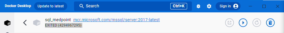 Почти сразу после запуска контейнер останавливается со следующим кодом выхода. Docker работает в режиме WindowsEngine. Вероятная причина (в моем случае) - остановка виртуальной машины. Для проверки - открыть гипервизор. Убедиться, что DockerDesktopVM Работает. В моем случае была Остановлена. Добавлял памяти, чтобы крутить SQL Server 2017, вот и забыл включить после увеличения оперативы. Хотя вроде как в одном из CU для MSSQL 14.x было снижение ограничения RAM до 2 GB, странно...