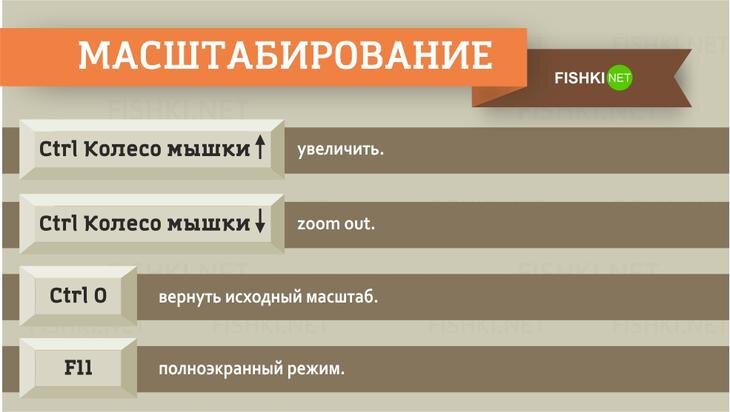 КОМПЬЮТЕРНАЯ ПОМОЩЬ Самые полезные клавиатурные сокращения, которые работают в любом браузере Самые полезные клавиатурные сокращения, которые работают в любом браузере Освоив эти нехитрые трюки вы сможете значительно увеличить производительность труда, поразите всех окружающих своими хакерскими умениями, ну и сможете продолжать серфинг даже при поломанной мышке. Масштабирование: Работа с вкладками : Навигация: Скроллинг: Адресная строка: Поиск: История & закладки: Другие функции: