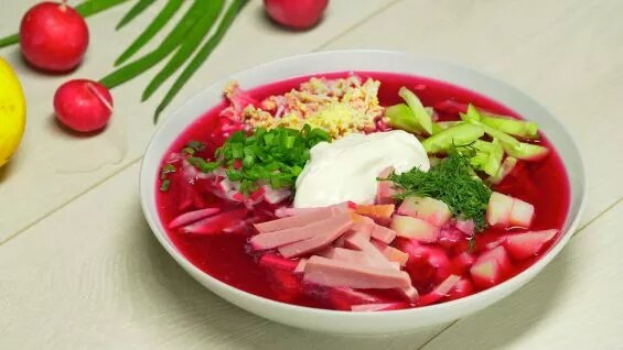 Свекольник. Рецептов этого популярного супа множество. Его подают горячим и холодным, мясным и рыбным, но его главным компонентом всегда остается свекла. Мнение о том, в какой стране придуман был свекольник расходятся, кто-то утверждает, что этот суп родом из России и Украины, кто-то полагает, что впервые его приготовили на Средиземноморье, бесспорно одно - свекольник одинаково популярен и любим во многих странах. Свежие и вареные овощи, в сочетании со свекольным отваром или родниковой водой и даже с простоквашей или кефиром, дают неповторимый вкус и аромат этому полезному и очень красивому супу. Наш видео рецепт поможет вам приготовить свекольник очень быстро, уверены такой суп обязательно придется вам по вкусу, а в жаркий летний день не забудьте добавить в него пару кусочков льда. Время приготовления: 45 минут Количество порций: 8 Калорийность: 77 kCal Ингредиенты Как приготовить свекольник