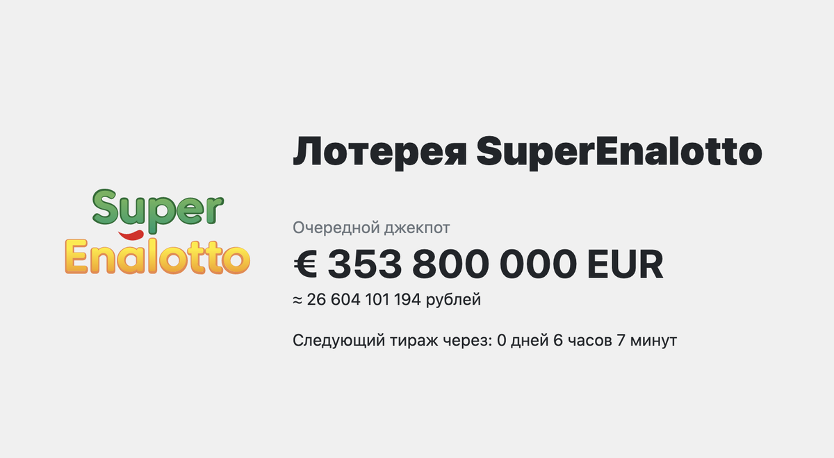 🔥 Джекпот #SuperEnalotto - €353,8 миллиона евро, что по текущему курсу составляет 26,6 миллиардов рублей! Динамика изменения джекпота С 02.01.2018 года джекпот SuperEnalotto был разыгран 8 раз, в последний раз суперприз игры в размере €156.1 миллионов Евро был разыгран 22.05.2021. В среднем джекпот разыгрывается 1 раз в 161.6 дней. Частота выпадения номеров шаров Каждый шар должен выпасть одинаковое количество раз. После 773 тиражей это 51.53 раз каждый (773 * 6 / 90). В случае с лотереей SuperEnalotto разброс количества выпадений шаров составил от 36 до 72. Статистика сумм выпадавших номеров При математическом ожидании в 273 (1+2+3+...+90 / 90 * 6) за последние 773 тиражей среднее арифметическое значение составило 276,6, за последние 100 тиражей - 259.38, максимальная сумма номеров шаров зафиксирована на уровне 424, минимальная - 142. Периодичность выпадения номеров За последние 773 тиражей лотереи SuperEnalotto шары с номерами 15, 37, 68, 66, 65, 72 выпадали чаще остальных, каждые 1