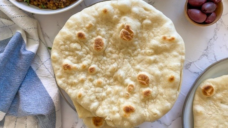 Такой хлеб характерен для разных кухонь мира. Лепешки едят на Востоке, в Африке и в Бразилии. А еще они характерны для традиционной греческой кухни. И из-за разнообразия начинок в мировой кулинарии, аскетичная пита или лепешка, кажется нам чем-то удивительным и экзотическим. Но на самом деле испечь ее очень просто. Понадобятся самые доступные ингредиенты для теста, сковорода с толстым дном и скалка. Ингредиенты: Как готовить: 1. Подогреть воду до теплого. Растворить в ней сахар и дрожжи. Не на огне! Оставить опару, пока не появятся пузыри от активировавшихся дрожжей. 2. Муку просеять, смешать с солью. 3. Начать вводить мучную смесь в опару. Сначала замешивать тесто ложкой, а затем выложить на стол, присыпанный мукой, и продолжать месить его руками около 5 минут. 4. Смазать 1 столовой ложкой масла большую миску. Уложить тесто в эту посуду, накрыть пищевой пленкой или полотенцем, и поставить в теплое место на 1 час подходить. Тесто должно увеличиться минимум вдвое. 5. Затем его разделит