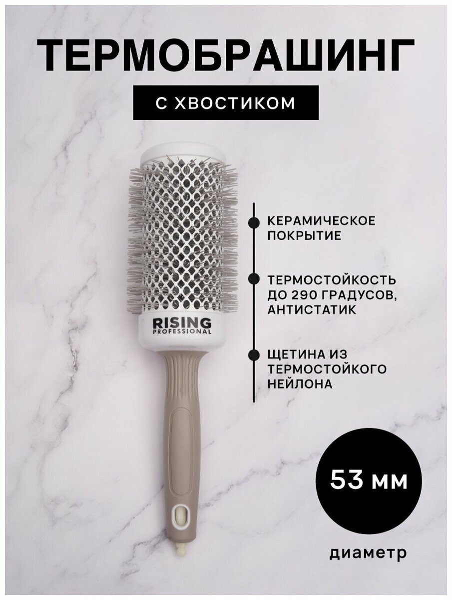 1. Керамический брашинг, круглая щетка с напылением и ионизацией, Профессиональная цилиндрическая расческа брашинг для укладки и объема волос, 53 мм. Профессиональная расческа термобрашинг с ионизацией и эффектом антистатика создана для ультракомфортной ежедневной укладки. Щетинки не травмируют поврежденные волосы и кожу головы, а специальная керамическая основа круглого брашинга помогает бережно запечатывать кутикулу волоса и защищать кончики волос от сечения. Штифты разной длины из термостойкого нейлона распутывают пряди и приподнимают волосы от самых корней. Круглая щетка станет прекрасным и недорогим инструментом для сушки и укладки. Вам не понадобятся стайлеры и утюжки - керамика брашинга быстро нагревается и разглаживает волосы одним движением. Расческа термобрашинг подходит для выпрямления и завивки волос, также для укладки стрижки по форме и для прически на свадьбу и другие мероприятия. В комплекте есть специальный хвостик для разделения прядей. Цилиндрическая расческа брашинг