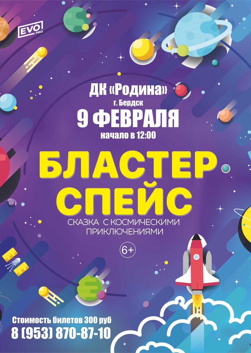 Отважный космический рейнджер Бластерспейс и его верная кибер-подруга Маруся направляются на поиски неопознанного объекта, который посылает непрерывный сигнал «SOS». Незапланированная экологическая миссия оборачивается настоящим испытанием для героя – в фантастическом лесу ему приходится действовать в одиночку, но он не теряет надежды завершить отважную миссию. Спектакль с интерактивными элементами, яркие характерные персонажи, современные музыкальные номера. Стоимость билетов 300р. Билеты можно приобрести в кассе Дворца культуры «Родина» Телефоны для справок 89538708710 / 4-11-97 МАУ «Дворец культуры «Родина» г. Бердск, ул. Микрорайон, 48Б Сайт: https://rodinaberdsk.ru ВК: https://vk.com/dkrodina.berdsk 6+ Реклама Источник: сайт Бердск-Онлайн