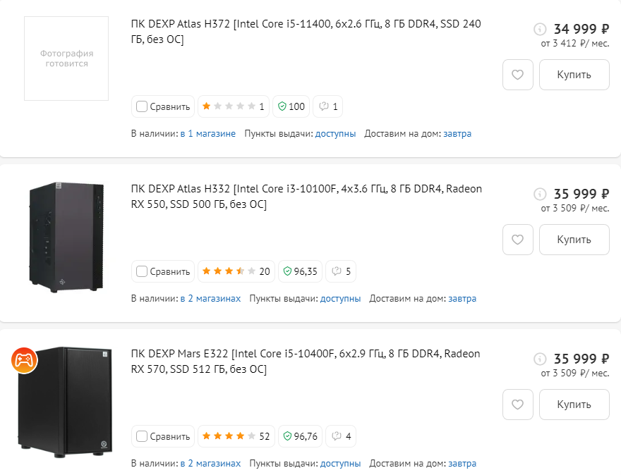 Отечественный маркетинг, бессмысленный и беспощадный. Стоят в магазине DNS три разных компьютера, причем существенно разных, а стоят практически одинаково. Про один из них, последний, я уже писал. Кстати, ещё вчера он стоил на 1000 рублей дешевле. То есть практически одинаковые конфигурации системы, но при этом одна с видеокартой Sapphire RX570 8GB, а другая со встроенной графикой Intel UHD Graphics 610, стоили одну и ту же сумму денег. Сегодня к этому добавился ещё один вариант. Видеокарта и процессор послабже, но денег стоит ровно тех же. Где логика? ) Напоследок напомню, что, по моему мнению, сейчас наиболее удачное время, чтобы обновить компьютер. Ажиотаж спал, курс стабилизировался, цены оттолкнулись от дна и начали как видим, обратный рост. В то же время Тайвань пока никто не бомбит, а если вдруг там начнется, то боюсь, что компьютер надолго станет артефактом ушедшей эпохи. Повторюсь, это мое личное мнение, не является инвестиционной рекомендацией или призывом к действию либо б