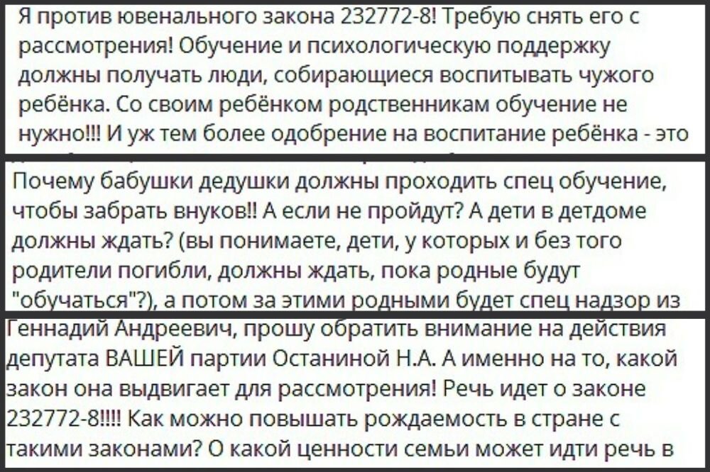 24 января пройдет первое чтение законопроекта «О внесении изменений в отдельные законодательные акты Российской Федерации по вопросам защиты прав детей». Вынесла его на чтение Председатель Комитета Государственной Думы по вопросам семьи, женщин и детей, депутат от фракции КПРФ Нина Останина. Законопроект предусматривает ряд изменений в процедуре оформления опеки над детьми, которые остались без родителей. В частности, желающие усыновить ребенка или родственники, которые хотят оформить опеку, должны будут пройти социально-психологическое обследование. Также по результатам этого обследования специалисты могут направить желающих усыновить ребенка на «подготовку» к принятию ребенка в семью. Этот закон вызвал широкий общественный резонанс. Пользователи сети буквально «разорвали» комментарии под постами лидера партии КПРФ Геннадия Зюганова. «Что за беспредел творит Останина! Остановите ее наконец с ее бредовыми законами», «Требую отстранить Останину от должности!», - пишут рассерженные поль