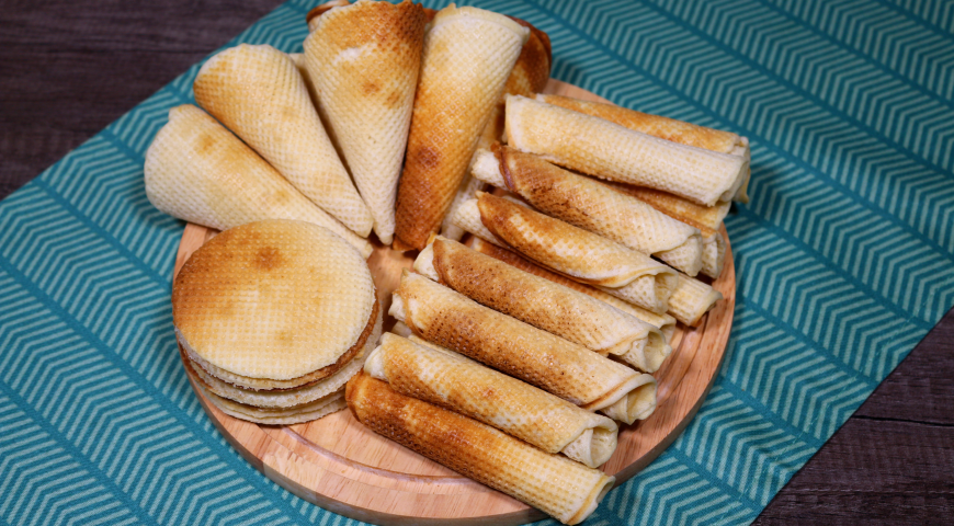 Хрустящее лакомство к чаю. Время готовки 1 ч Количество порций 32 шт. ИНГРЕДИЕНТЫ ПОШАГОВЫЙ РЕЦЕПТ ПРИГОТОВЛЕНИЯ Шаг 1 Сливочное масло режем на небольшие кусочки (чтобы быстрее растопить), кладем в небольшой ковшик и топим его на среднем огне. Шаг 2 Растопленное масло вливаем в глубокую емкость, добавляем сахар, ванилин и муку, просеянную через сито. Тщательно перемешиваем все ингредиенты. Шаг 3 Далее в тесто постепенно вливаем молоко и продолжаем замешивать тесто. Делаем это до тех пор, пока оно не станет похоже по консистенции на жирную густую сметану. Шаг 4 Разогреваем мультипекарь с насадками для приготовления вафель. Когда он будет разогрет, выкладываем 1 столовой ложки теста в каждую формочку и закрываем его крышкой. Выпекаем тесто 2 минуты. Как только снимаем вафлю с формы, ее нужно тут же горячую свернуть в трубочку, конус либо любую другую форму. Шаг 5 Затем готовим следующую порцию вафель и так до тех пор, пока не закончится все тесто.