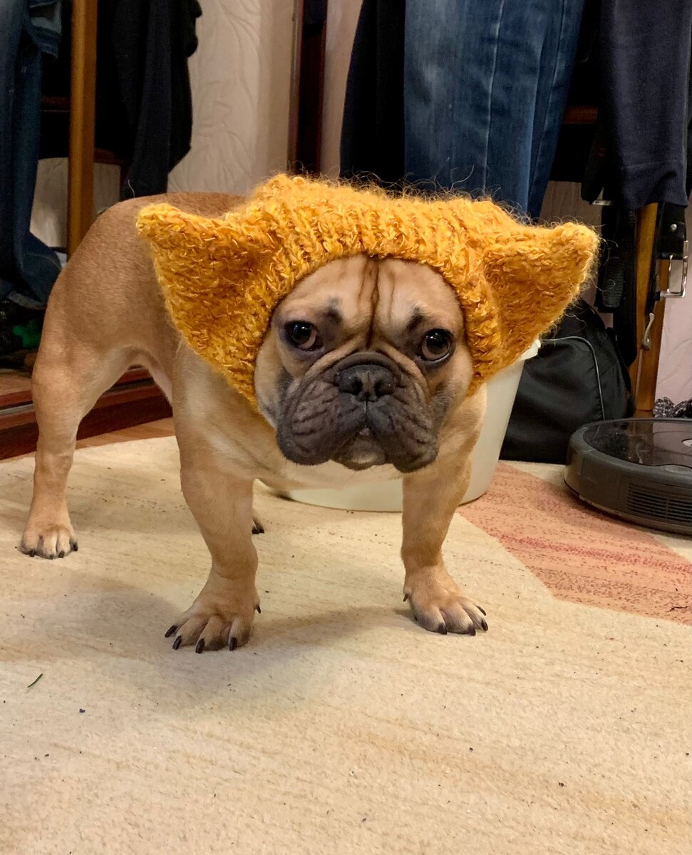 В морозы холодно не только людям. Друзья человека тоже мерзнут. Еще как мерзнут! Связала костюмчик для французского бульдога. Нужно заметить, что одежду он сильно не любит, но вы и сами это поймете по его взгляду.))) Шапку вязала из фантазийной итальянской пряжи с добавлением двух ниток мохера в тон. После стирки распушилась, все как надо. Внизу, под горлышком, пустила шляпную резинку, чтобы не сползала при прогулках. Шапка связана тоже по меркам, плотная, хорошо закрывает уши и наглядно демонстрирует умный лоб француза. Свитер вязала из рассказовской шерсти (3-нитка) + 1 нитка рассказовской ангоры. Вязалось тяжело, жестко, но после стирки стала очень приятная на ощупь и тоже распушилась. Хвостатый парень у нас брутальный мачо, широкогрудый. Росток пришлось вывязывать в 6 см (я мужу меньше на свитерах вяжу росток))) Узоры свитера комбинированные. На спинке араны, резинка 1х1 на вороте и попе, "букле" на рукавах и резинка 2х2 на грудке. Шапка лицевая гладь и резинка 1х1. Вязала сверху н