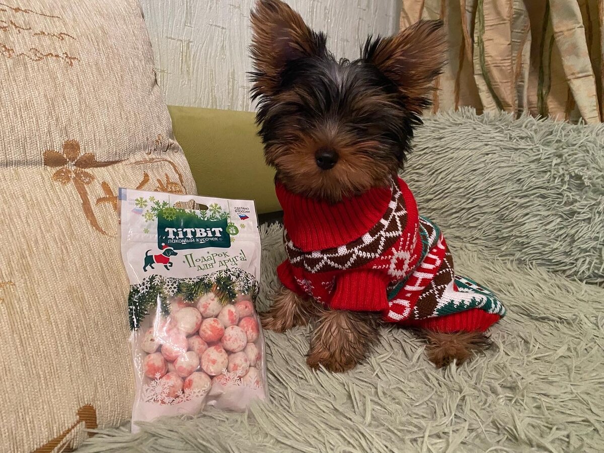 С появлением Тима, мне стали доступны не только покупки вещей для собак, игрушки и многое другое, понятно куда летит большая часть моего бюджета, но так же знакомство со снеками и собачьими конфетами! Тима уж больно понравилась новогодняя коллекция Tit Bit Лакомства для собак «Конфеты мясные с клюквой»(Новогодняя коллекция) - пакетик с zip-замком и новогодним дизайном, бело-красными шариками, с запахом мяса - для маленькой собачки, конфета большая, но для меня это плюс, на полчаса собака занята делом, крупная собака слопает сразу - вкусное и натуральное угощение, которое легко можно взять с собой на прогулку, отличный перекус и поощрение для занятий - приготовлено без использования сахара, безопасно для животных - состав: рис, мясо и мясные субпродукты, кукуруза, дрожжи пивные, масло растительное, мальтодекстрин, гидролизат печени говяжьей, клюква, минеральные вещества - не вызвало пищевой аллергии и проблем с жкт Объем 70 гр И порадовать своего питомца и занять его делом, когда н