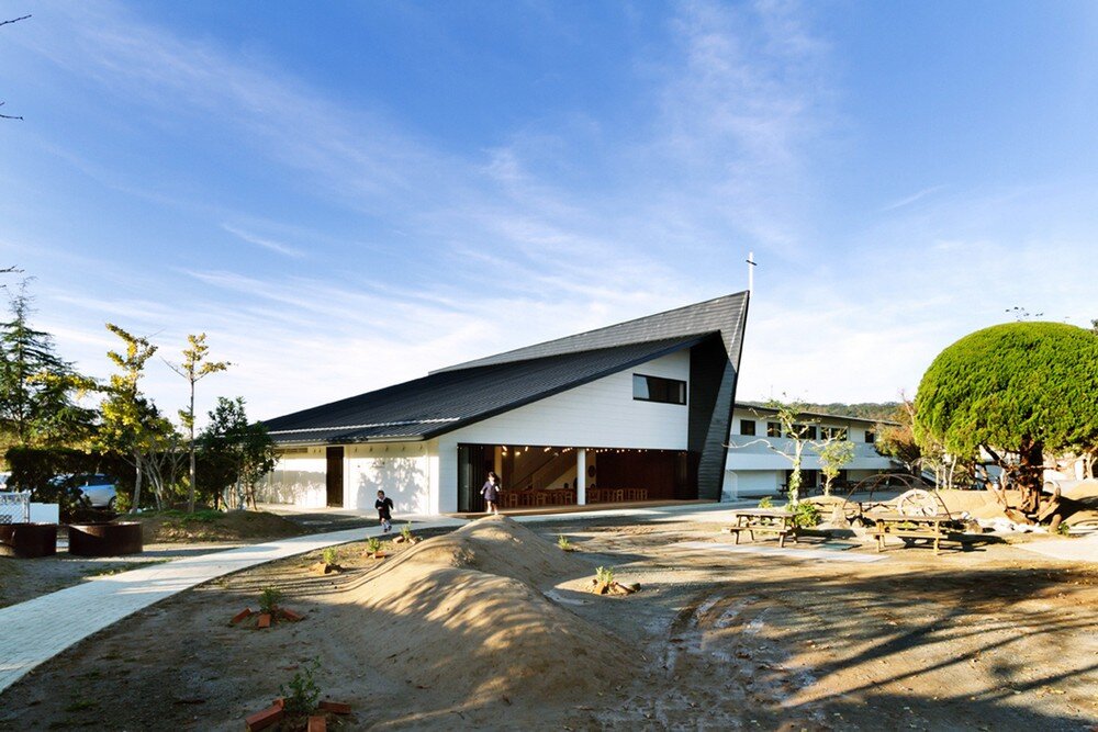 Построенный в японском городе Акуне, детский сад АМ располагается всего в нескольких сотнях метров от живописной береговой линии. Ранее заброшенный земельный участок стал идеальным местом для строительства дошкольного заведения, подарив возможность детям проводить время в окружении природы. Близость к морю обязала архитекторов студии Taku Hibino в целях безопасности поднять уровень пола в яслях, расположив группу по центру здания. Остальные помещения спроектированы на разных высотах и соединены посредством 10 лестниц, 3 горок и спортивных снаряжений. То есть дети могут подняться на верхний этаж по лестнице или канату, а спустится, например, по горке. Такая организация пространства стимулирует развитие малышей, побуждает к физической активности и взаимодействию.