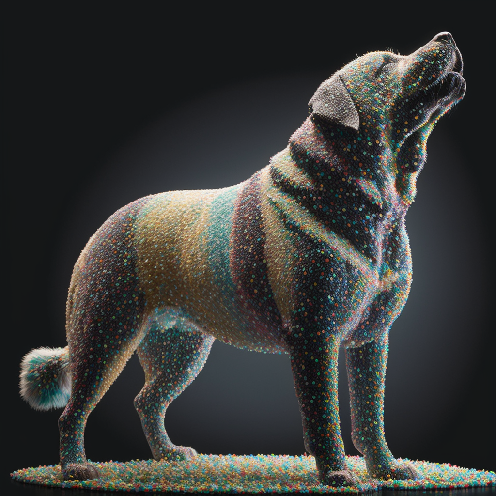 Пуантилизм формирует разноцветную конфетную скульптуру большой собаки, стряхивающей с тела воду.