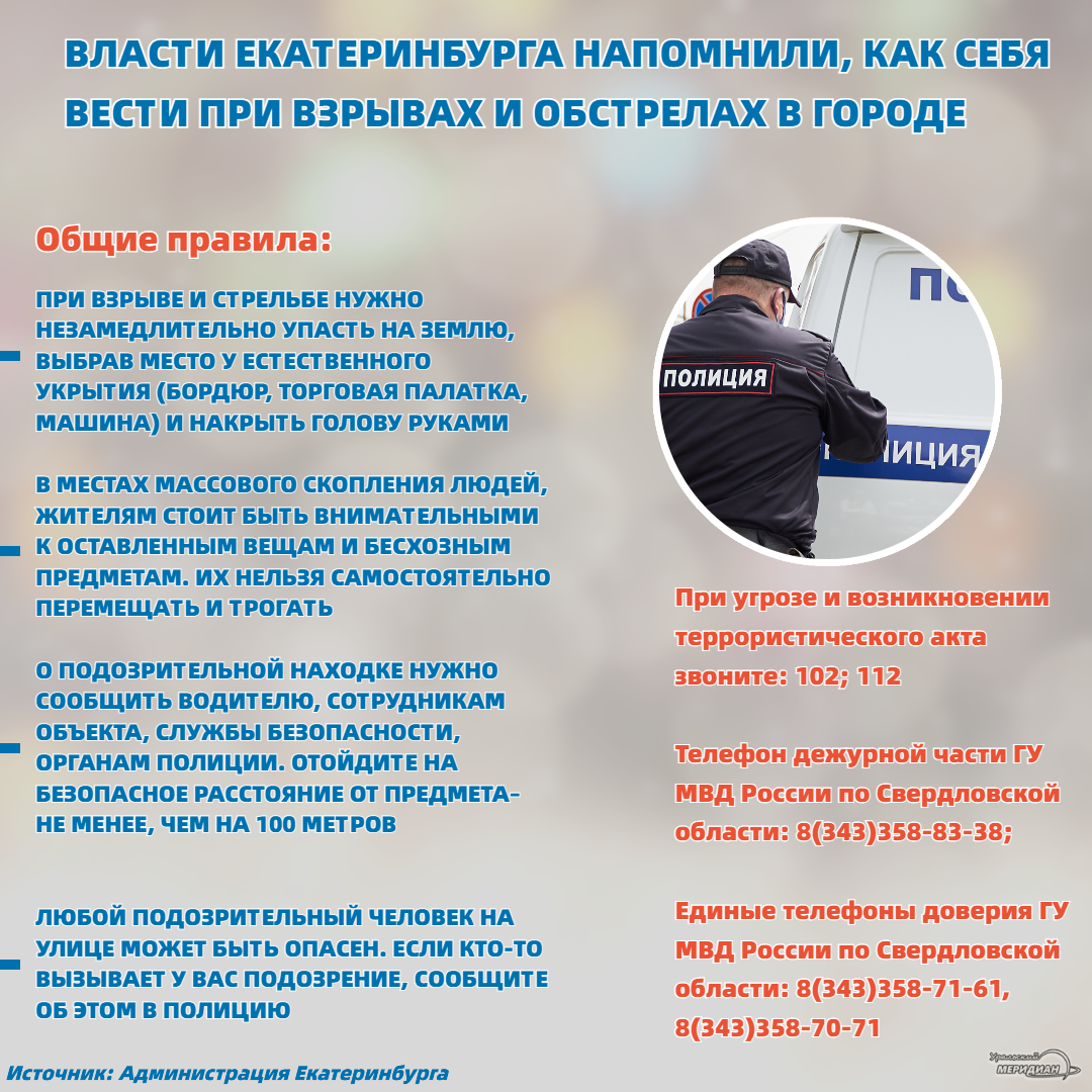 Власти Екатеринбурга напомнили, как себя вести при взрывах и стрельбе из оружия в городе , опубликовав на официальном городском портале памятку о поведении в случае террористических угроз. При взрыве и стрельбе нужно незамедлительно упасть на землю, выбрав место у естественного укрытия (бордюр, торговая палатка, машина) и накрыть голову руками. В местах массового скопления населения, таких как транспорт, культурно-развлекательные, спортивные и торговые центры, гражданам стоит быть внимательными к оставленным вещам и бесхозным предметам. Их нельзя самостоятельно перемещать и трогать. О подозрительной находке нужно сообщить водителю, сотрудникам объекта, службы безопасности, органов полиции. При обнаружении подобных предметов на улице нужно также сообщить о сомнительном предмете правоохранителям, а самим до приезда специалистов отойти на безопасное расстояние – не менее 100 метров. – Любой подозрительный человек на улице может стать быть опасен. Если кто-то вызывает у вас подозрение, соо