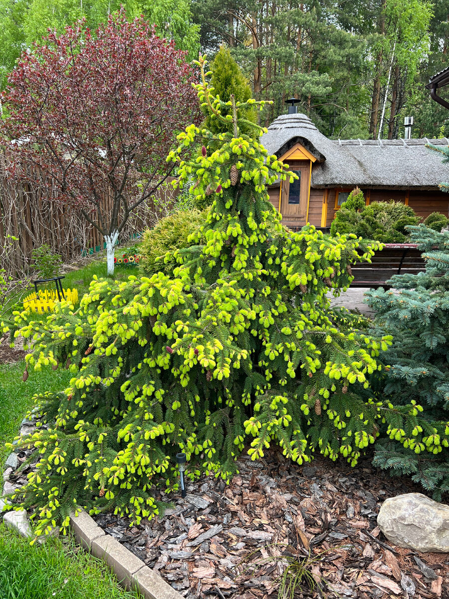 Корневая система у нее замульчирована с момента посадки. Зимой периодически стряхиваю с нее толстый слой снега. Не притеняю уже (в первый год посадки притеняла сеткой), не укрываю. Кормлю весной один раз комплексным удобрением для хвойных. Не болела ни разу. Однажды увидела на ней еловую тлю. Она облепляет веточки и питается соком хвои. Достаточно было одной обработки Искрой.