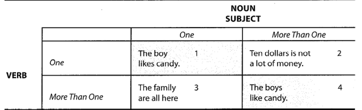 Наиболее часто встречаются комбинации под номерами 1 и 4. Но как же объяснить комбинации 2 и 3? Здесь как раз и вступает в дело семантика. Благодаря выбранной форме глагола, мы понимаем, что автор во втором случае рассматривает 10 долларов только как общую сумму, а не набор, состоящий их отдельных купюр; а в третьем случае воспринимает семью как институт, состоящий из некоторого множества отдельных людей.