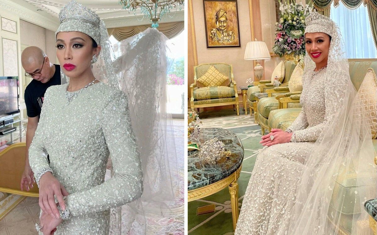 Отмечу, что жених и невеста традиционно облачаются в праздничные серебристо-белые наряды. И сияют бриллиантами похлеще ювелирных витрин. Азема Ниматул Болкиах предстала в изящном платье невесты, которое подчеркивало ее точеную фигурку. Само платье – настоящее произведение искусства, как портных, вышивальщиц, так и ювелиров: оно сплошь расшито дорогими камнями! А длинная фата, ниспадающий шлейф-водопад, вторит сияющему серебристому облачению принцессы.
